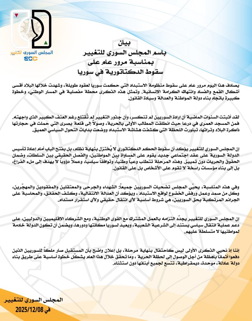 إن المجلس السوري للتغيير يؤكد أن سقوط الحكم الدكتاتوري لا يُختزل بنهاية نظام، بل بفتح الباب أمام إعادة تأسيس الدولة السورية على عقد اجتماعي جديد يقوم على المساواة بين المواطنين، والفصل الحقيقي بين السلطات، وضمان الحقوق والحريات دون تمييز. وهذه المرحلة تتطلب وعياً وطنياً، وتوافقاً سياسياً، وعملاً دؤوباً لا يهدف إلى ملء الفراغ، بل إلى بناء مؤسسات راسخة لا تقوم على الأشخاص بل على القانون.